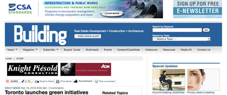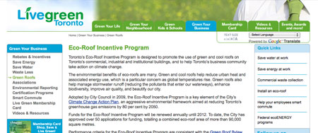 Toronto launches green initiatives designed to build a more sustainable city. The City of Toronto introduced two initiatives designed to "green" Toronto's new building stock: the Toronto Green Standard and Green Roof Bylaw.